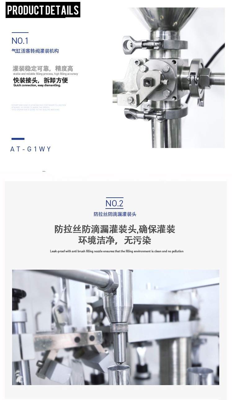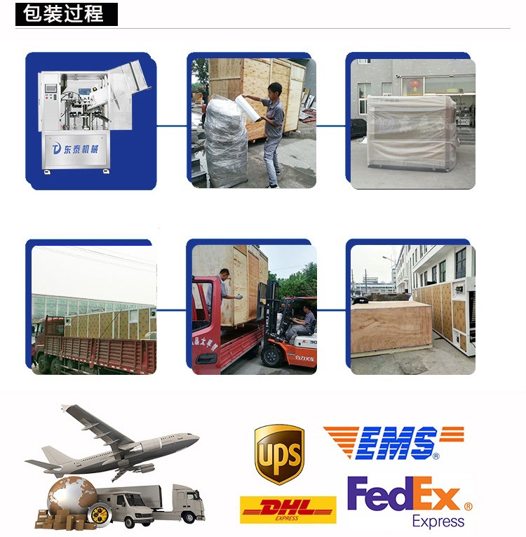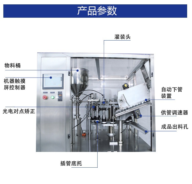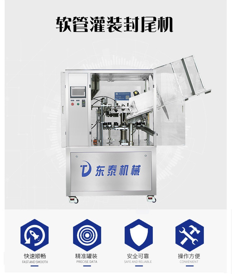 1.適用于醫(yī)藥、食品、化妝品、日用化工等行業(yè),對復合管,塑料管,鋁管進行灌裝封尾。可將各種糊狀、膏狀、粘度流體等物料順利準確地注入軟管中,并完成封尾和打批號、