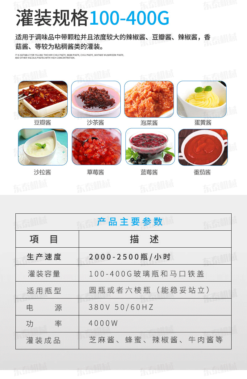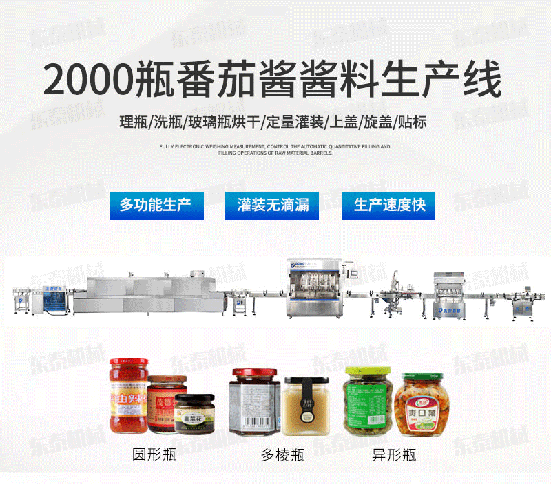 番茄醬灌裝機生產(chǎn)線適用于調味品中帶顆粒并且濃度較大的辣椒醬、豆瓣醬、辣椒醬,香菇醬、等較為粘稠醬類的灌裝。灌裝轉閥可以根據(jù)客戶物料定做加大,以適應不同客戶物料的灌裝需求。配備臥式攪拌料斗,限度的保障在灌裝過程中物料均勻、無油醬分離,確保每一瓶的灌裝精度。