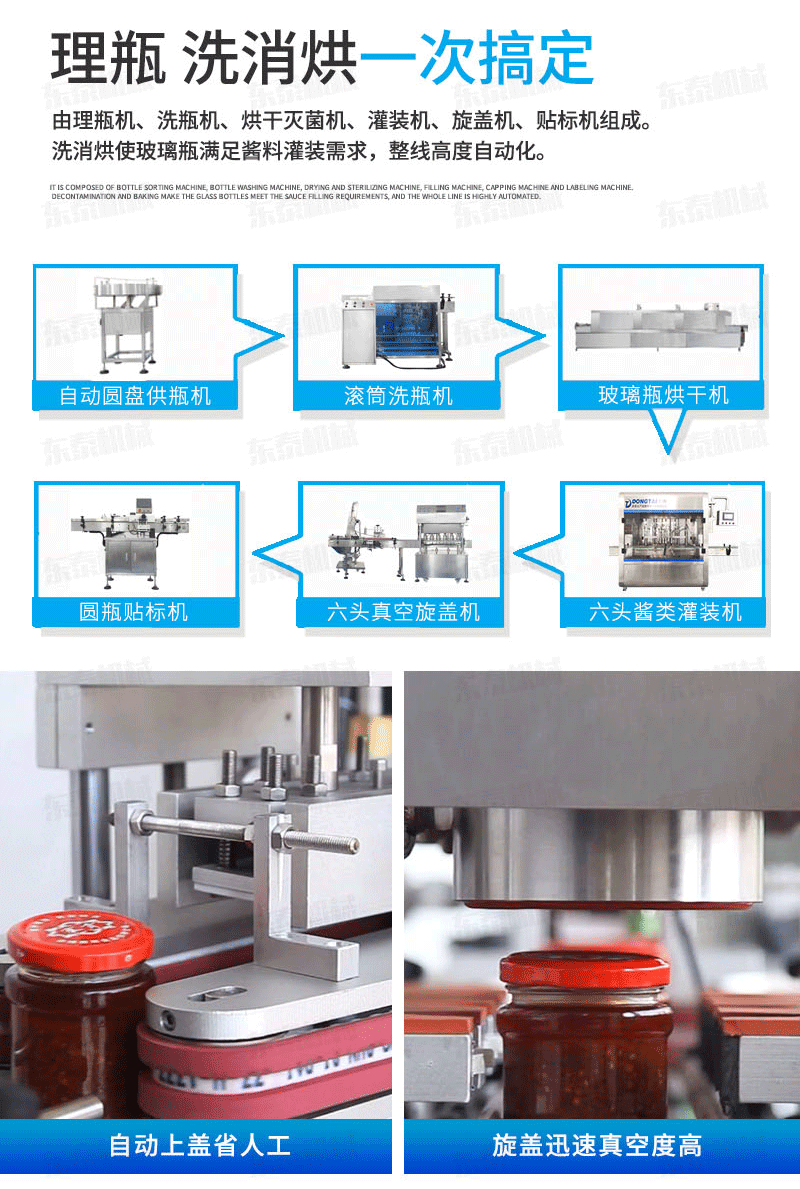 A、番茄醬灌裝機生產(chǎn)線基礎上進行改良設設計,醬料防滴防漏灌裝頭,在灌裝過程中不污染瓶口及瓶身,方便后續(xù)的旋蓋和貼標工序。