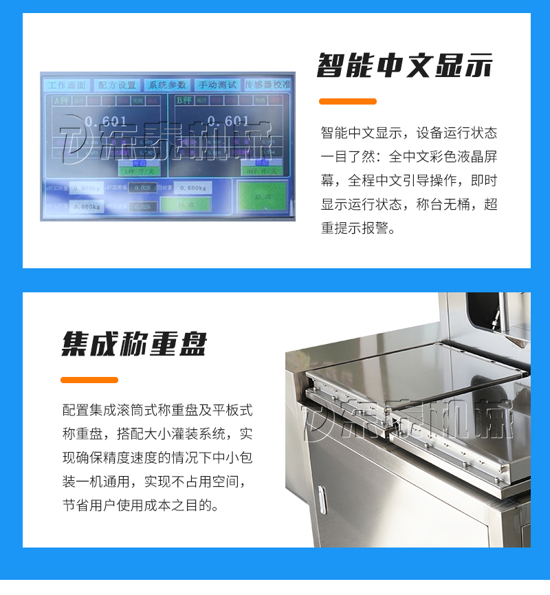 集成滾筒、平板稱重盤,一機多用,方便快捷:配置集成滾筒式稱重盤及平板式稱重盤,搭配大小灌裝系統(tǒng),實現確保精度速度的情況下中小包裝一機通用,實現不占用空間,節(jié)省用戶使用成本之目的。